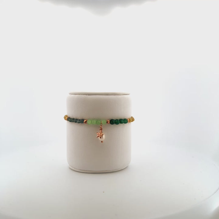 Ornato con preziose pietre sfaccettate verdi e decorato con una stella e una perla come pendenti