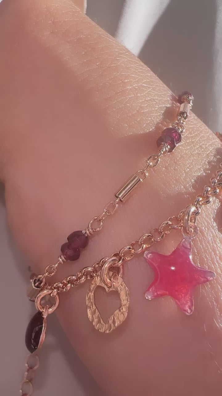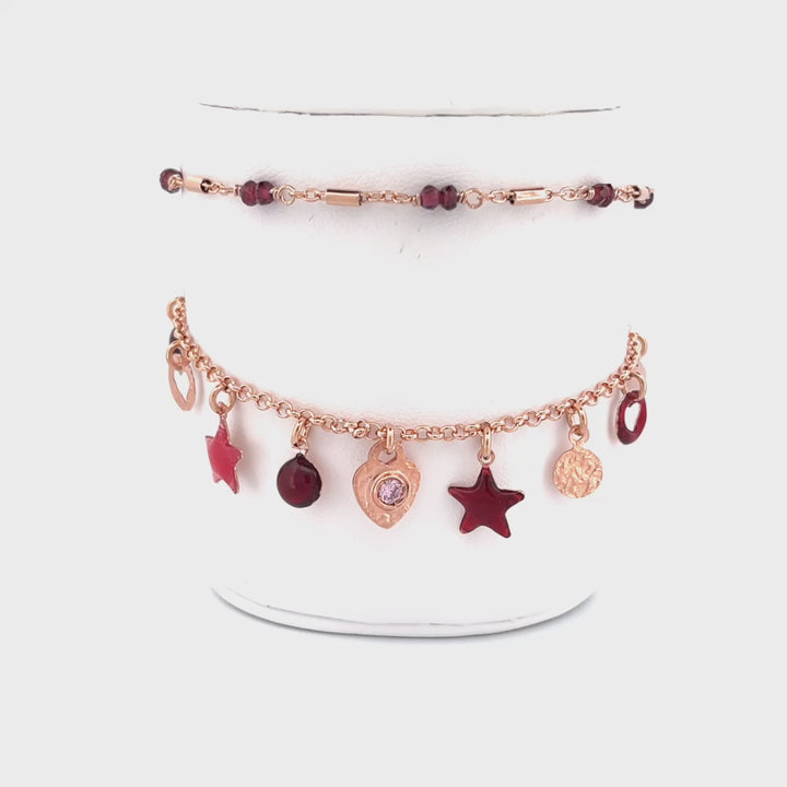 Composto da metà catena rolò e l’altra metà da pietre e catena cilindrica. Ai due lati, ad intervallare la catena c’è il Diadema con radice di rubino incassata e uno zircone champagne.