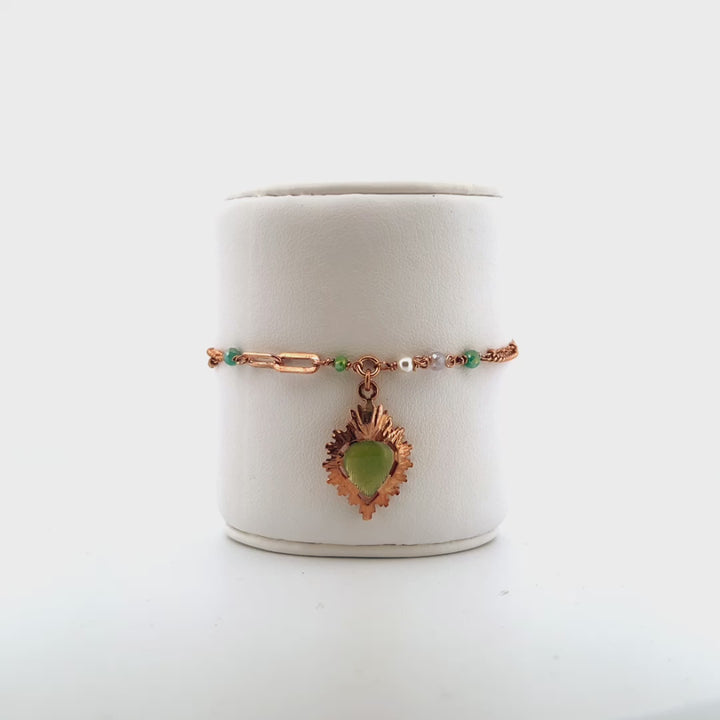 Maglia rolò e maglia a chicchi intervallate da pietre colorare e perle. Al centro presenta un cuore sacro smaltato verde