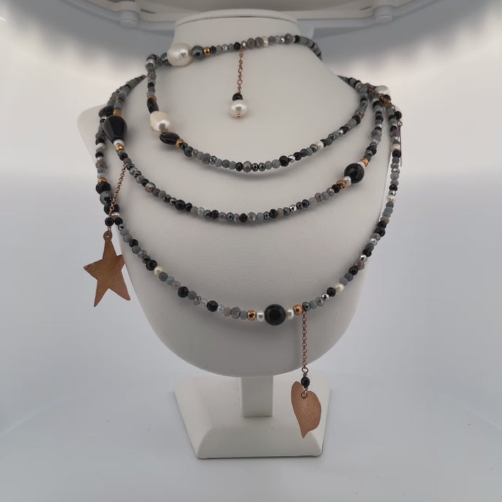 Composta da pietre colorate nere e grigie e pietrine, perle e pendenti con soggetto stella, cuore e luna in argento 925°% galvanica rosata. Può essere indossata a doppio o triplo giro.
