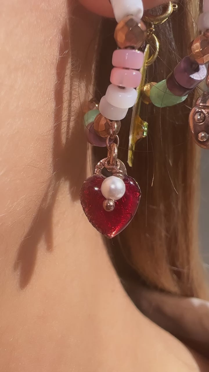 Composti da pietre colorate, con pendenti asimmetrici. Da una parte presentano un cuore smaltata bordeaux e dall’altra una coccinella rosata